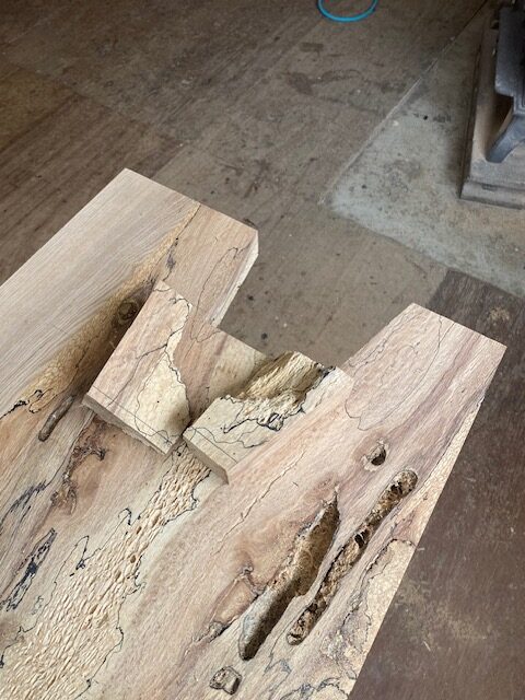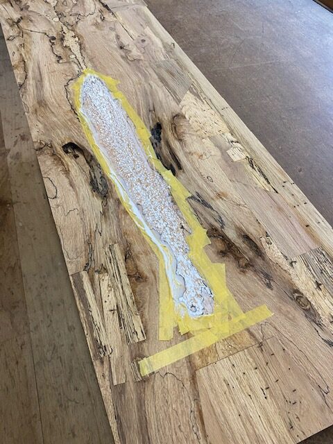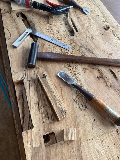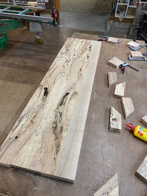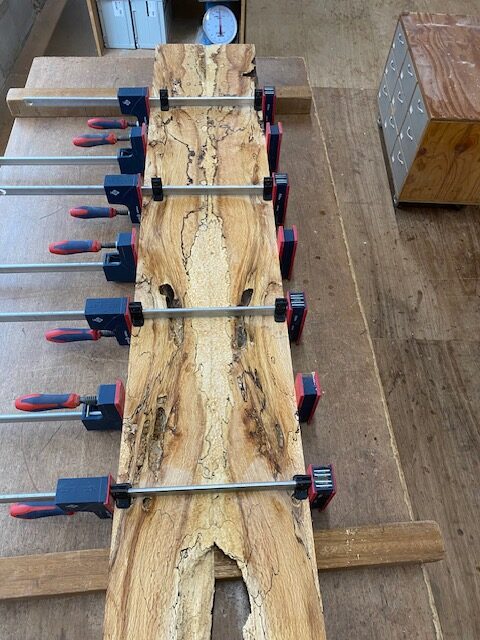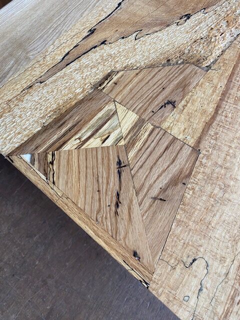 建築家をしてる方から自宅で使う化粧台の天板の注文。表情のある木材を使って欲しいと言う希望だったので、数年前に仕入れたとっておきの材木を提案。材はエノキ材で虫喰いが激しく白太も混じり、とても雰囲気のある一枚。それを本を開いたように貼り合わせる手法ブックマッチで繋ぎ、あまりに激しい虫喰いや割れなどは同じ材料で埋木して補修。単純に埋木してもつまらないので寄木をするように埋木して、違った表情を作っている。最後に細かなペーパーで磨き上げ、特殊なオイル塗装を施してあるので艶感も綺麗に仕上がっている。
