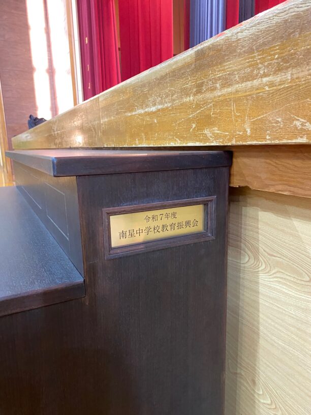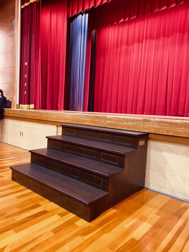 母校の南西中学校から卒業式に卒業生がステージに上がる立派な階段を作ってもらえませんか?と依頼があり作らせて頂いた。ゆったり登れるように踏み板の奥行きをたっぷり取り、階段の立ち上がり部分(蹴込み板)には白木で象嵌を入れた。これは1年前にオーストラリアのセントメアリー教会を訪れた時、教壇や他の家具などに長方形の象嵌が入っていてそれが良い緊張感を演出してると感じたため、今回オマージュさせてもらった。そして材質はウオルナット突き板。そのままクリアー仕上げでも素敵になるのだが、式典のものには重たい色が似合うので2回の黒染めを施し、歩いて滑らない様にノンスリップの塗装で仕上げる。とても頑丈に作ってあるがそこまで重くないので、移動も簡単に出来る。(もちろん設置面にはフェルトが貼ってあるので引きずっても安心)納品して体育館の置くと迫力があって我ながら格好良いと納得出来栄えだと思った。そして母校から依頼があって超嬉しかった。