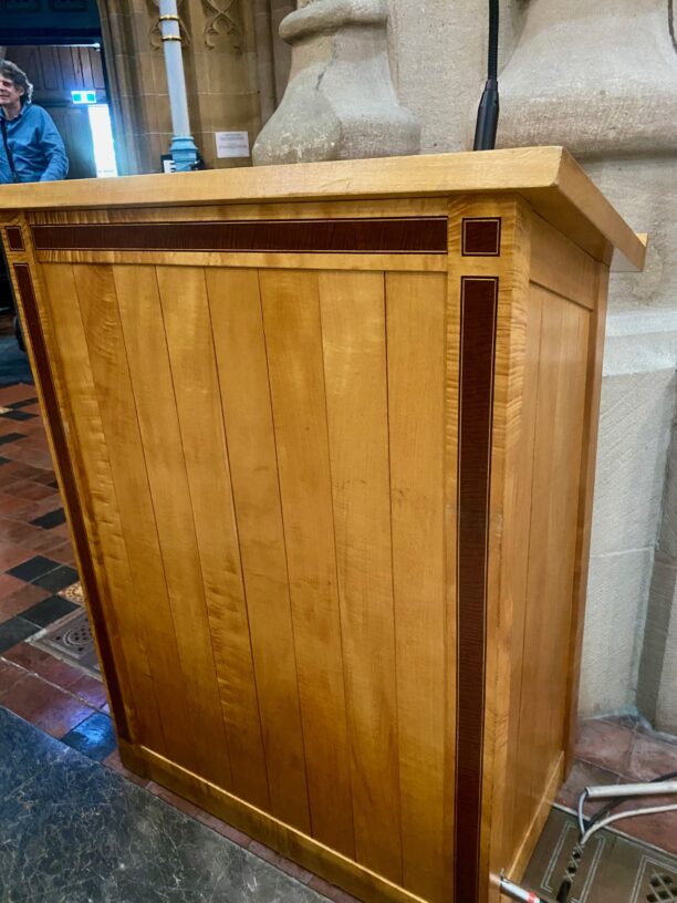 こちらがオーストラリアのセントメアリー教会で使っている象嵌の入った教壇。これをシンプルなデザインにしてオマージュさせてもらった。