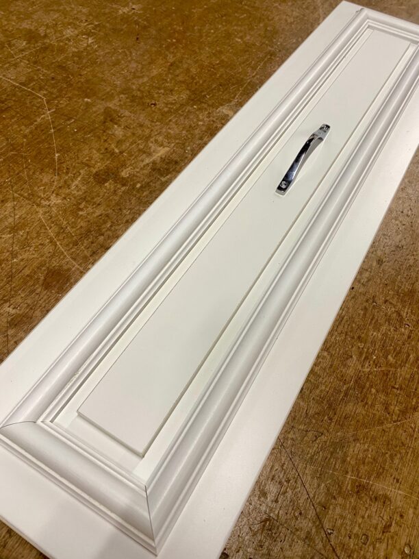 ウオークインクローゼットと言えば棚板数枚とポールがある簡素な空間を連想する。そこにプラスチックの衣装ケースなども加えて使うと 何だかゴチャゴチャしてしまうだろう。それなら最初から引き出し収納なども作り、そこに装飾を加えると言うのが私の考え方。綺麗な収納を作れば使うのも気持ち良く、そのキチンとした空間が持続できると思っている。そして男性と女性では身長が違うのでポール高さや棚板の高さまでしっかり狙って製作。正面になる四段×2連の引き出しは頻繁に使うので入り口正面に設置。白のモールディングを施しキラキラとした印象を見せるので、思わず「可愛い!」と声が出てしまう。